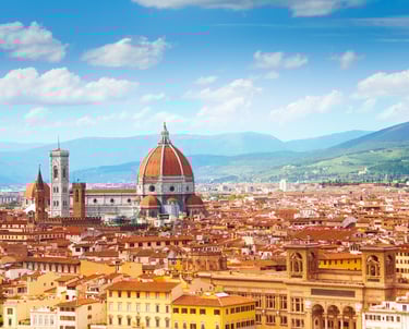 Viajamos hacia FLORENCIA, capital de la TOSCANA y cuna del Renacimiento, una de las ciudades más visitadas del país, considerada la cuna del Renacimiento y de algunos de los artistas y pensadores más influyentes de la historia, como Leonardo da Vinci, Miguel Ángel, Botticelli o Rafael. Destaca la catedral gótica (duomo), el antiguo puente de Piedra (Ponte Vecchio) con sus tiendas de orfebres y la plaza de la Signoria -el corazon politico de la ciudad con el ayuntamiento en edificio medieval.